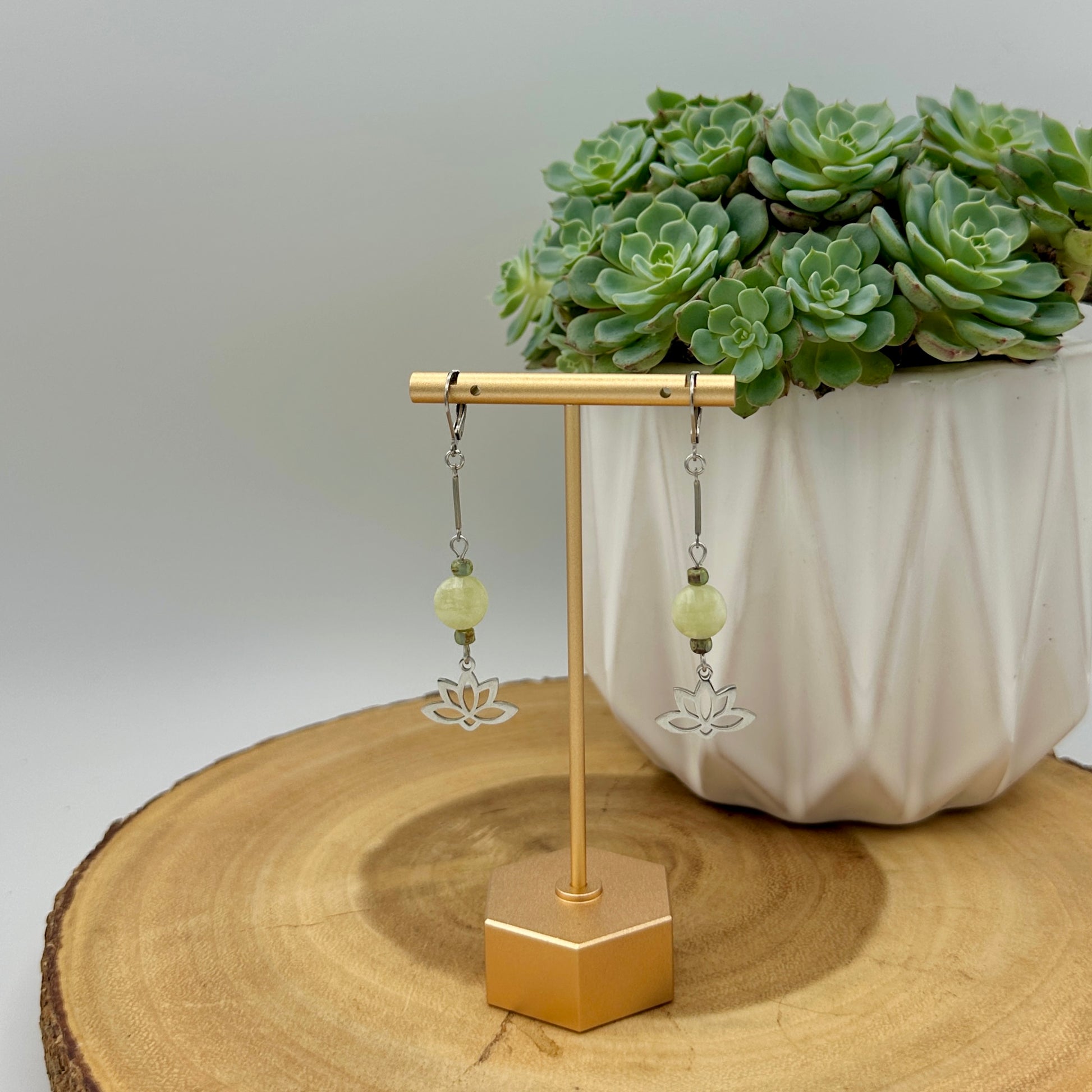 Lightweight dangle earrings with pale yellow-green serpentine jade beads, stainless steel connectors, and a stainless steel lotus flower. The lotus symbolizes peace, mindfulness, and spiritual growth.