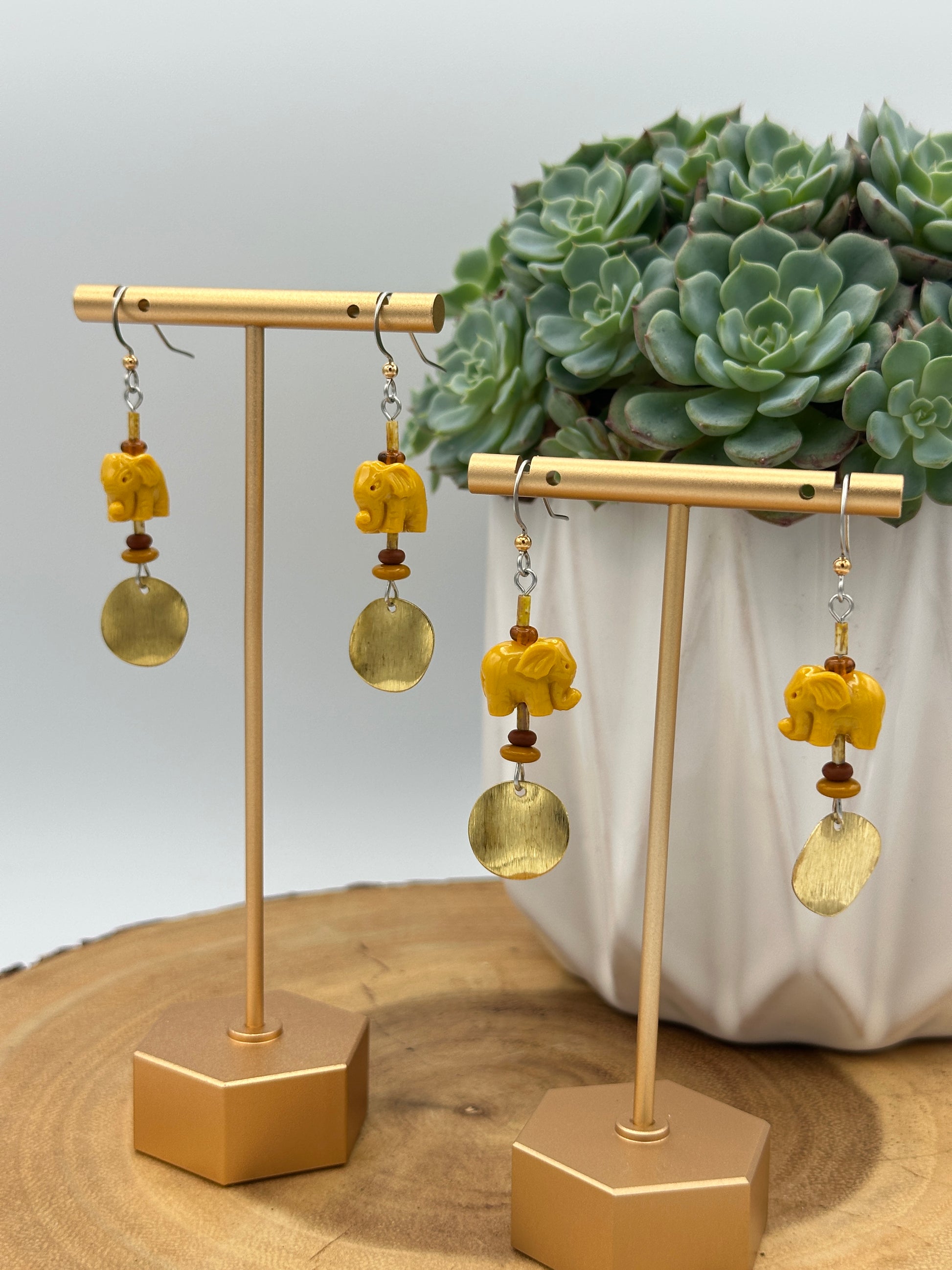 Mustard Yellow elephant focal bead with amber, brown, and mustard accents. Brushed brass circular disc drop at the bottom giving these dangles movement.